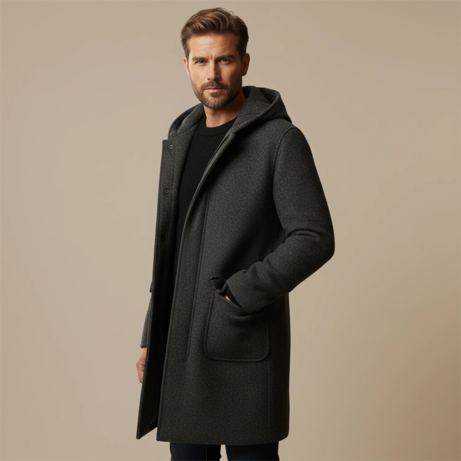 Dieser Mantel wurde aus dichter Wolle geschnitten, die Wind abhält und gleichzeitig einen geschmeidigen Fall beibehält, und bietet Wärme ohne unnötiges Volumen. Die strukturierte Kapuze und der verdeckte Frontverschluss verfeinern seine stromlinienförmige Silhouette, während ein glattes Innenfutter das einfache Überziehen in den kälteren Monaten gewährleistet.