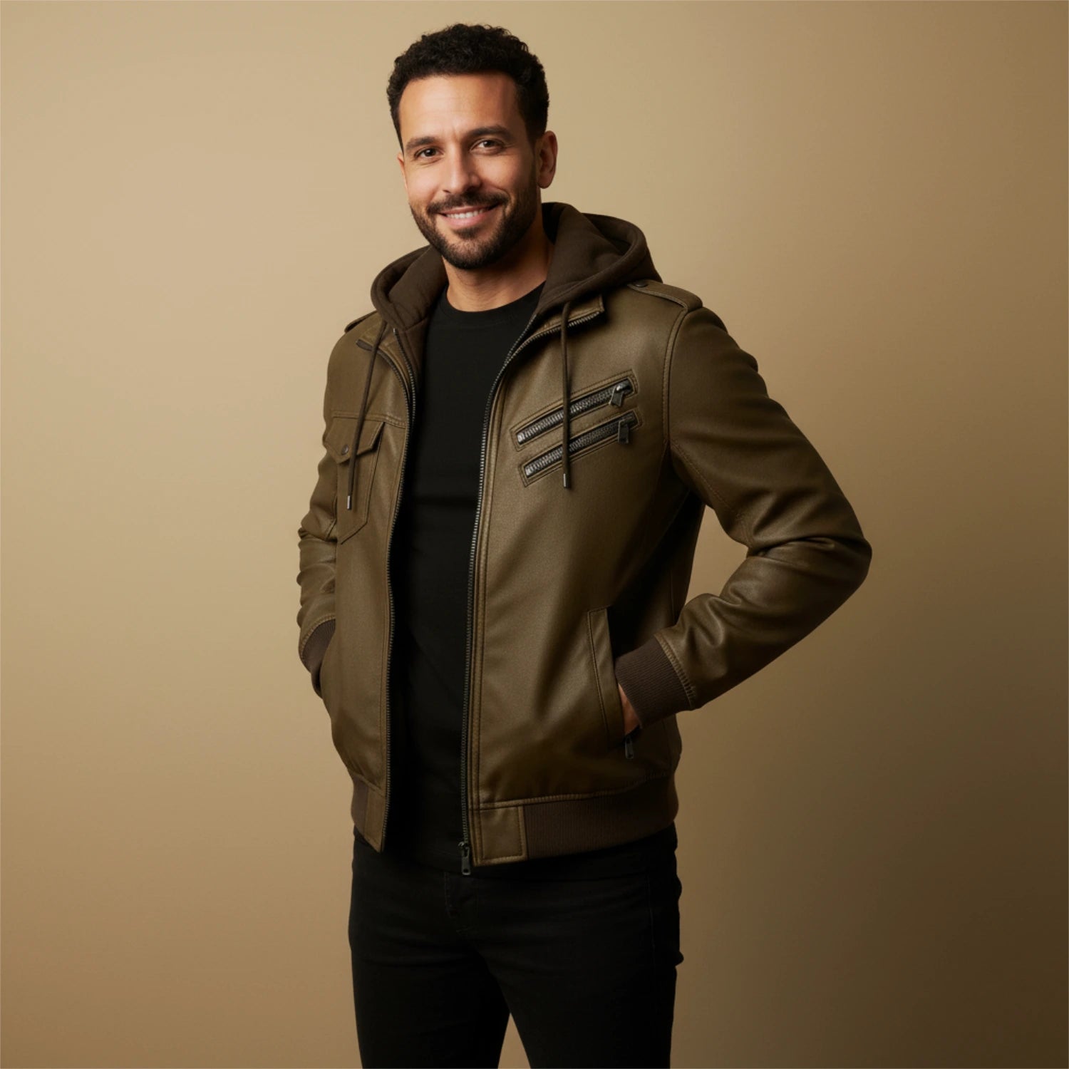 Konstruiert für Kälte und Wind, kombiniert diese Jacke ein strukturiertes Leder-Obermaterial mit einer weichen Innenschicht, die Wärme speichert. Die Oberfläche aus echtem Leder bietet eine natürliche Beständigkeit gegen Abnutzung, während gerippte Kanten und eine abnehmbare Kapuze für eine versiegelte, schützende Passform sorgen.