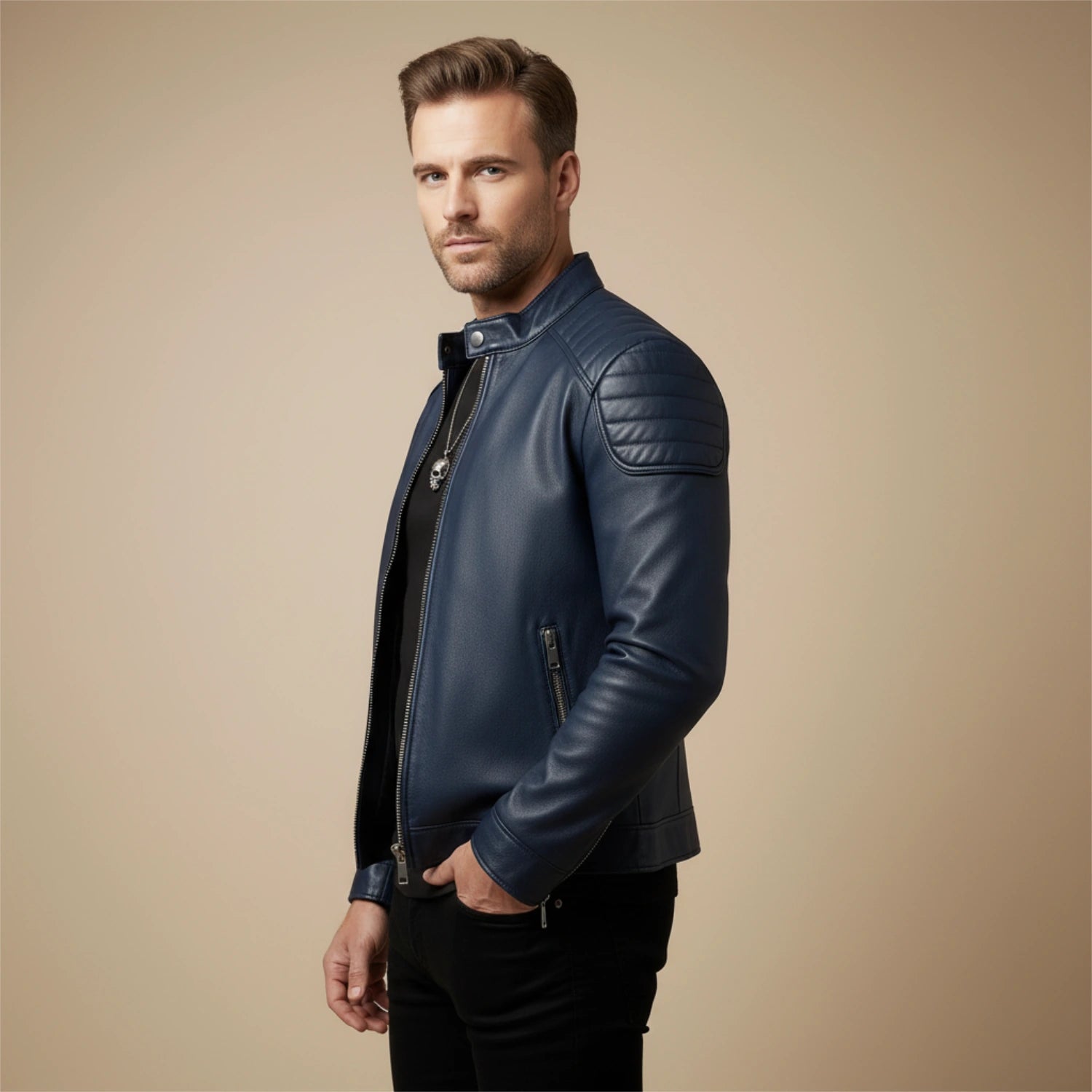 Gefertigt aus geschmeidigem echtem Leder, verleiht diese Jacke durch ihren festen, aber natürlichen Fall Struktur und Souveränität. Die gesteppten Schulterpartien und klaren Linien sorgen für eine definierte Silhouette, verstärkt für eine lange Lebensdauer. Ein glattes Innenfutter gewährleistet Bewegungsfreiheit und ganztägigen Komfort.